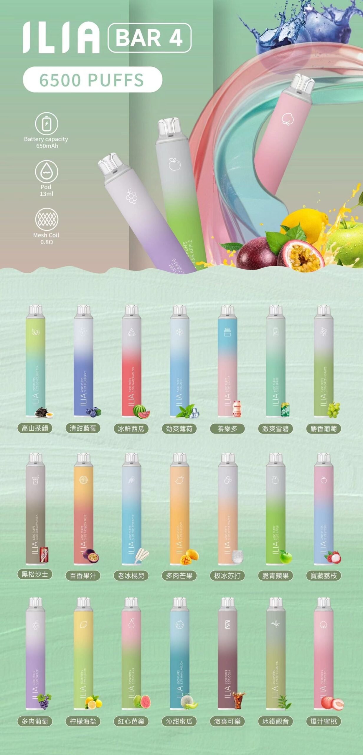 - 超大容量煙油ILIA拋棄式6500口擁有13ml的超大容量煙油箱,滿足長時間吸煙的需求,避免頻繁添加煙油。