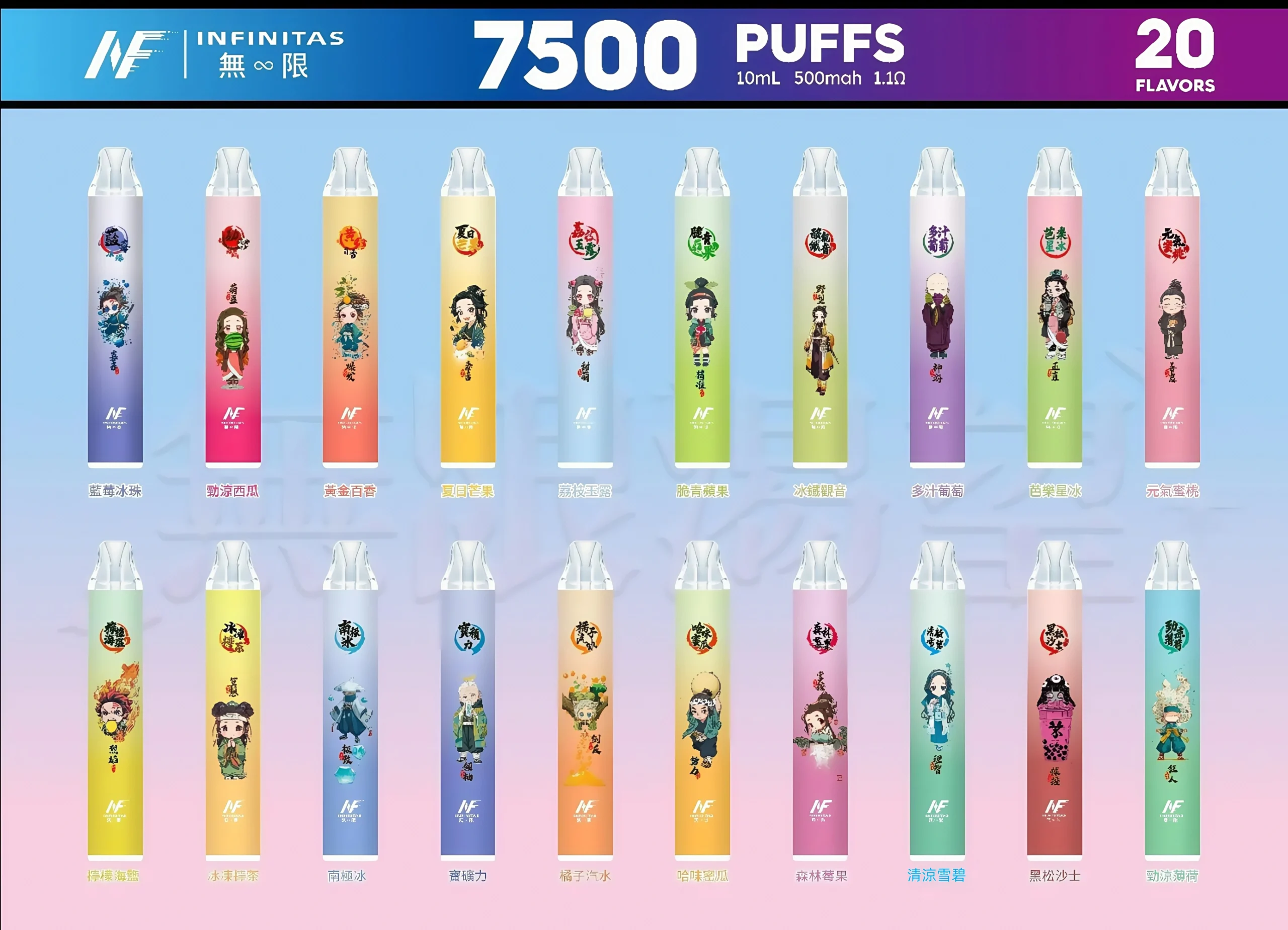 INF 無限 7500 的最大亮點是其 20 種口味,每種皆以《鬼滅之刃》角色為靈感設計,外殼圖案生動可愛。口味涵蓋水果、冰涼及獨特混合,適合不同偏好。以下表格整理各口味名稱(基於官方海報),包括中文名稱、角色對應及簡要描述: