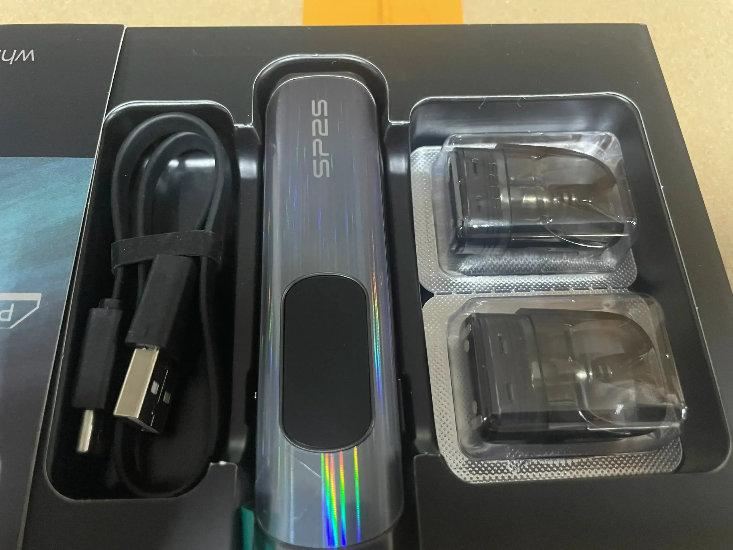 sp2s 注油主機搭載最大功率 30W,可搭配 0.6Ω 或 0.8Ω 空彈使用,提供多種吸阻選擇。其內建 1000mAh 電池,續航力持久,並支援 Type-C 快速充電